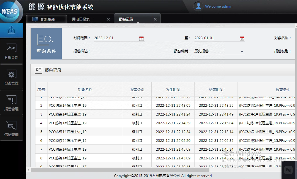 2、循环泵运行优化节能。废气回收车间有三台化学品循环泵,额定功率均为185kW,采用两用一备方式运行。通过系统历史数据查询功能发现循环泵运行功率均有一定程度的递增,3台循环泵运行功率分别高于历史最优值10kW、10kW和20kW。通过系统报警功能提醒用户及时维修。在用户对设备进行维修后,三台泵运行功率都恢复到了之前的最优值。每年可节约电费5万元。