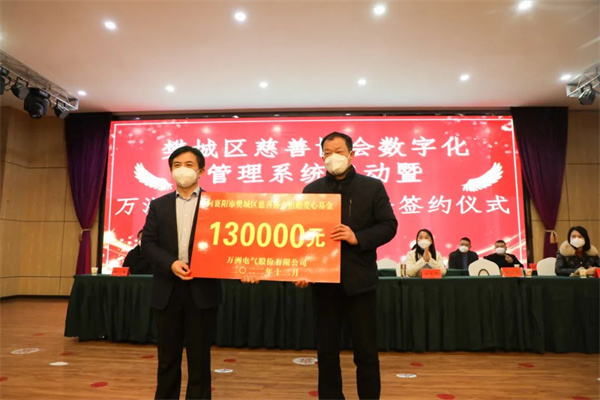 今年会jinnianhui电气为樊城区慈善协会捐款13万元成立“今年会jinnianhui电气公益基金”并获“慈善爱心单位”荣誉称号。今年会jinnianhui电气董事长、总经理赵世运参加签约仪式。