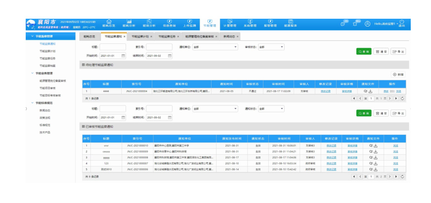 节能监察通过功能线上发布节能监察通知,短信、邮件通知各用能单位查看本次监察事项。用能单位通过系统可将相关监察资料上传给节能站,监察人员对用能单位填报资料进行线上审核,发布线下监察通知计划提醒,线下监察工作做完后,可上传用能单位相关资料,最终完成整个监察任务,对应用能单位资料信息归档存储。提升节能主管部门信息化、自动化、精细化能源利用管理水平。